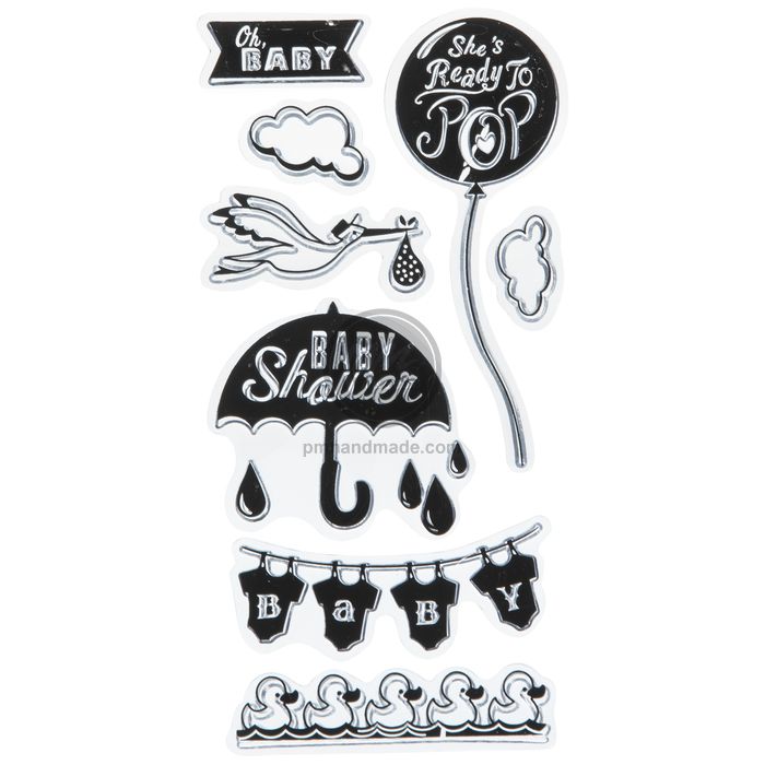Bộ clear stamp baby shower in đẹp trên mọi chất liệu giấy. Dấu đế là cao su trong chắc chắn được làm bằng nhựa trong suốt cứng cáp, với hình dạng và thiết kế là dù, áo, cò, bong bóng.... Giúp bạn bổ sung thêm vào những tấm thiệp theo chủ đề như sinh nhật, tặng gia đình, bạn bè mà bạn muốn gởi gắm tình cảm vào.