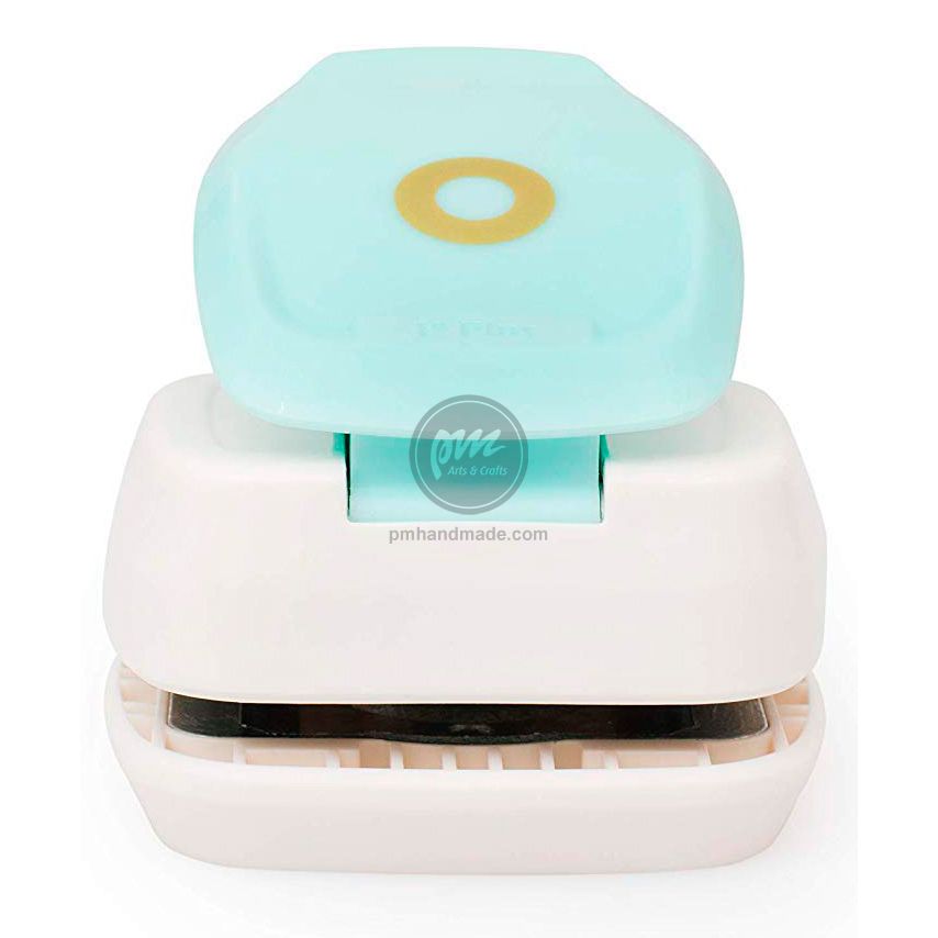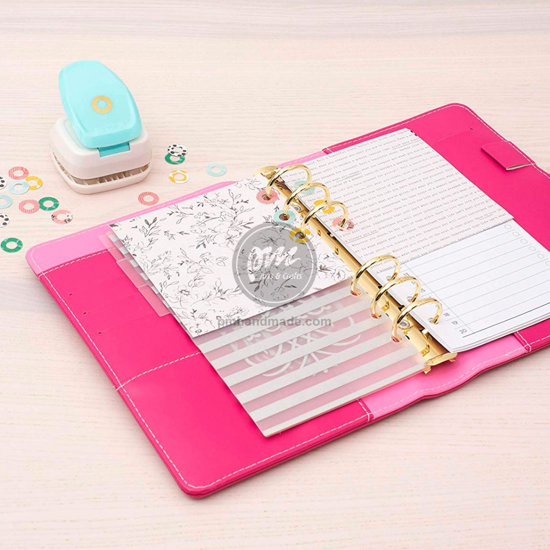 Đặt giấy vào dụng cụ, bấm 1 lực xuống. Các vòng tròn hình chiếc bánh donut sẽ rơi ra bạn có thể tận dụng các mẫu giấy này để trang trí thêm lên sản phẩm của mình, sau đó dùng khoen, ribbon để cố định các giấy lại thành 1 quyển sổ, scrapbook, album. Giúp tác phẩm của bạn bớt đơn điệu.