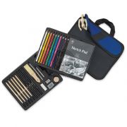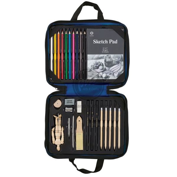 1 túi đựng , 5 Bút chì vẽ , 10 bút chì màu, 3 bút chì charcoal, 2 blending stumps, 1 quyển sổ Sketch pad 5"x7", 1 Manikin 4.5", 1 Sanding block, 1 Tẩy Kneaded, 1 tẩy White, 1 Chuốt chì Metal