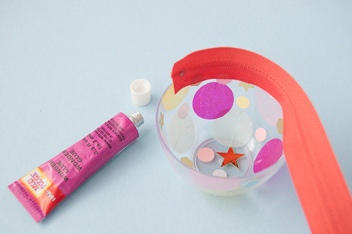 B4: Sử dụng keo siêu dính để dán cẩn thận một mặt của dây kéo vào mép trên của một trong những chiếc bát. Bắt đầu bằng cách gắn phần cuối của dây kéo, xếp nó sao cho các răng của dây kéo hơi lùi lại so với mép bát - nếu chúng quá gần nhau, thanh trượt của dây kéo sẽ không thể vừa khít. Và dùng kẹp giấy cố định lại và đợi keo khô hoàn toàn