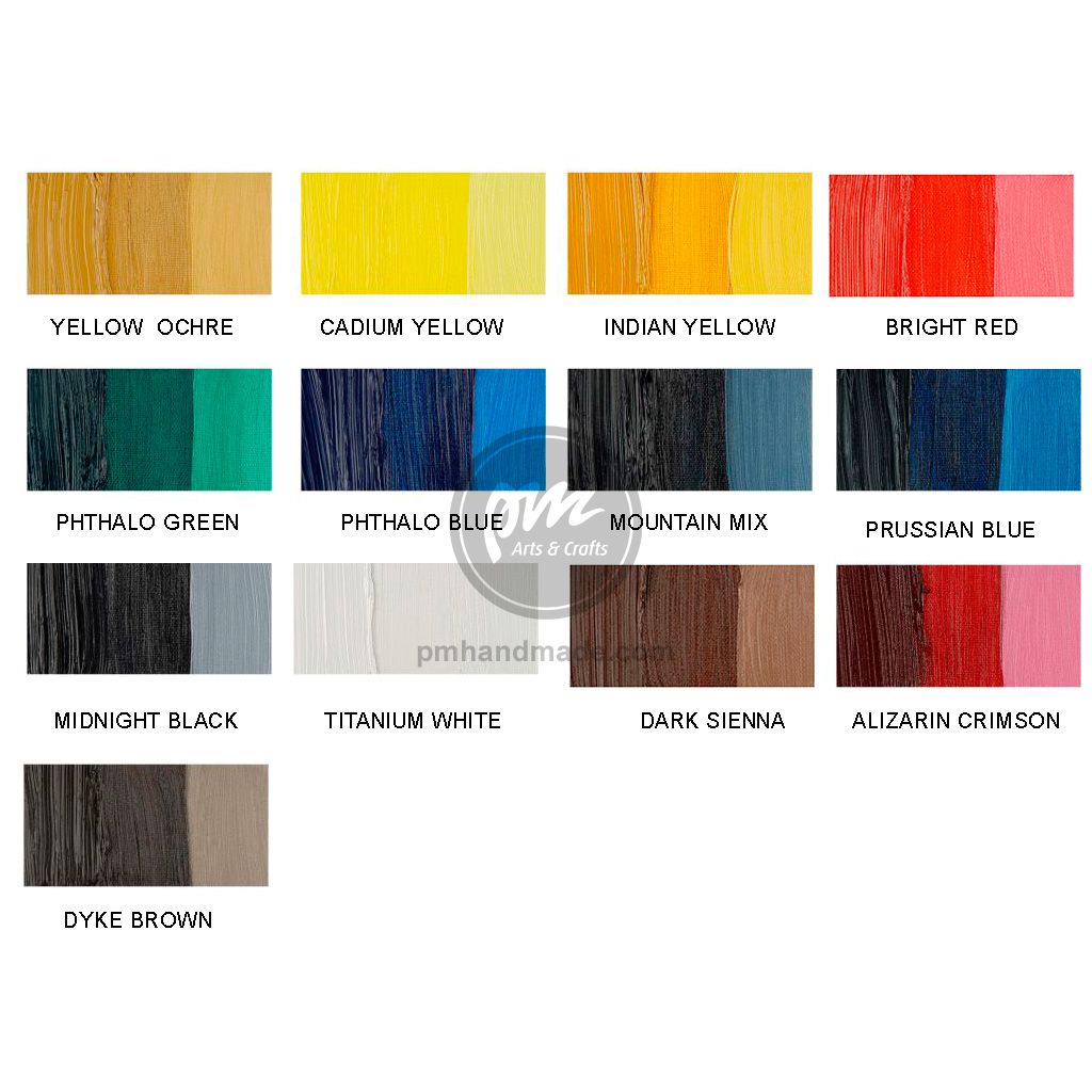 Có nhiều màu sắc khác nhau, bao gồm màu truyền thống cũng như một số sắc thái độc đáo được tạo riêng cho các bức tranh mà ông sử dụng. Sơn có độ đặc mịn và dễ pha trộn, lý tưởng để vẽ tranh phong cảnh, cảnh thiên nhiên mềm mại, trông tự nhiên.