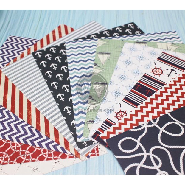 Tập giấy in hình Paper pack chủ đề Nautical Rose có màu sắc bắt mắt và đáng yêu mang chủ đề biển, hải dương, bao gồm các hình hoa sọc, mỏ neo, chấm bi, kẻ sọc, và nhiều màu sắc biển ấn tượng.